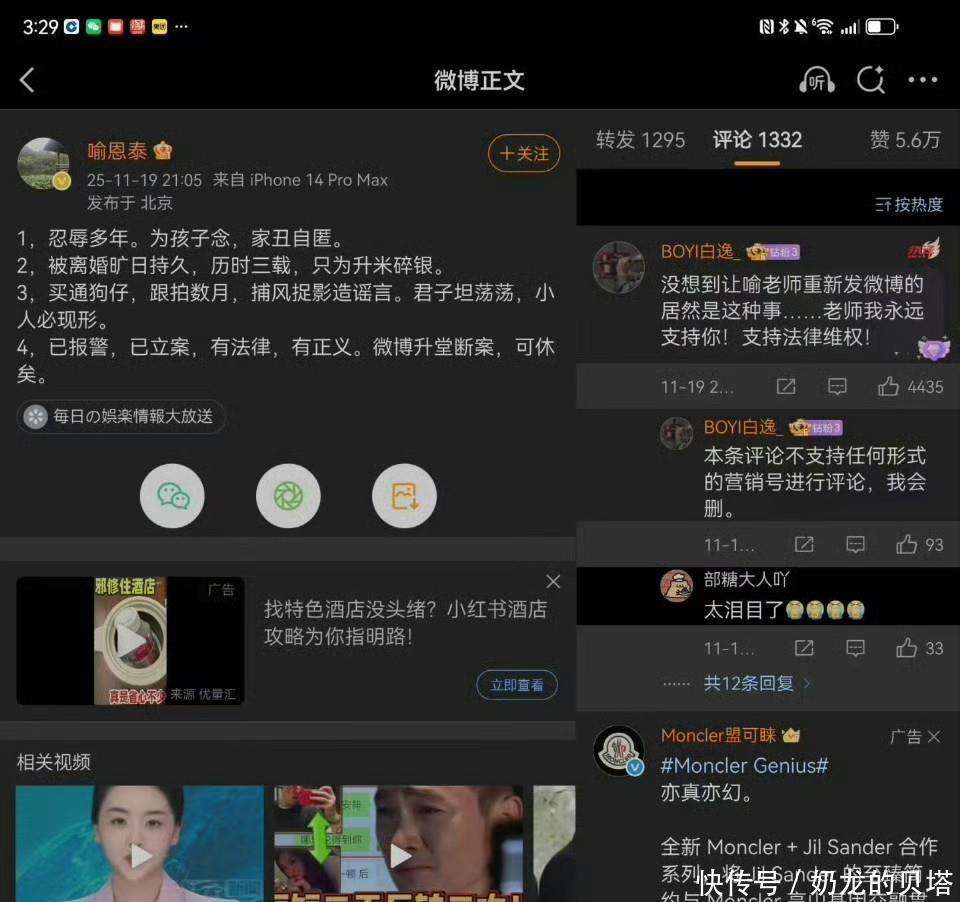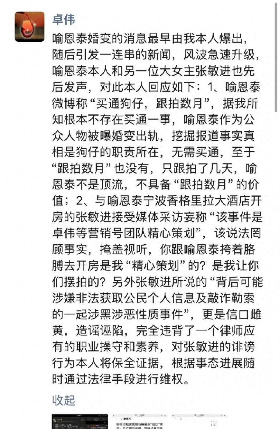 这场闹剧的开端本是一场狗血婚变。11月中旬,卓伟率先爆料喻恩泰与妻子史林子分居三年、离婚诉讼已开两庭,还指控他转余箱茅台、停付抚养费,把“吕秀才”塑造成了抛妻弃子的渣男。可没过一天,就有“共同好友”反戈,爆料史林子长期婚内出轨,甚至带情人回家同居,行车记录仪都拍了下来。紧接着,喻恩泰本人五年来首次更新微博,直指对方买通狗仔“跟拍数月造谣言”,还晒出了报警立案回执。就在双方各执一词、舆论反复反转时,卓伟的回应堪称“神来之笔”。他不辩解爆料真假,反倒纠结“跟拍天数”,言外之意很明确:喻恩泰没那么火,花数月时间盯他根本不划算。这话听着像吐槽,实则暴露了狗仔行业的生存逻辑——爆料不是为了揭露真相,而是为了流量变现。顶流明星的一张模糊照片就能引爆热搜,而喻恩泰这类“戏红人不红”的演员,即便有婚变猛料,也得靠“转移百万茅台”“婚内出轨律师”这类噱头才能博眼球。